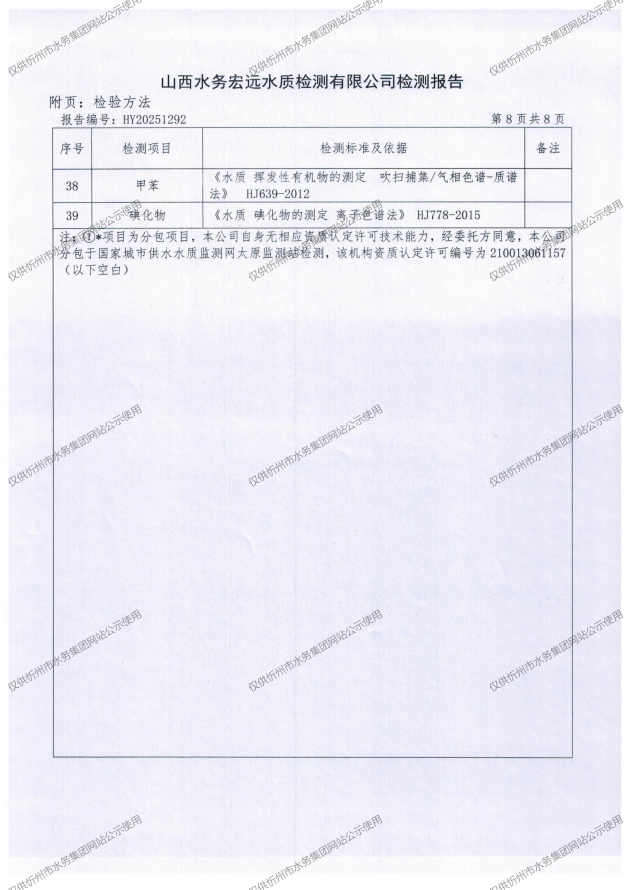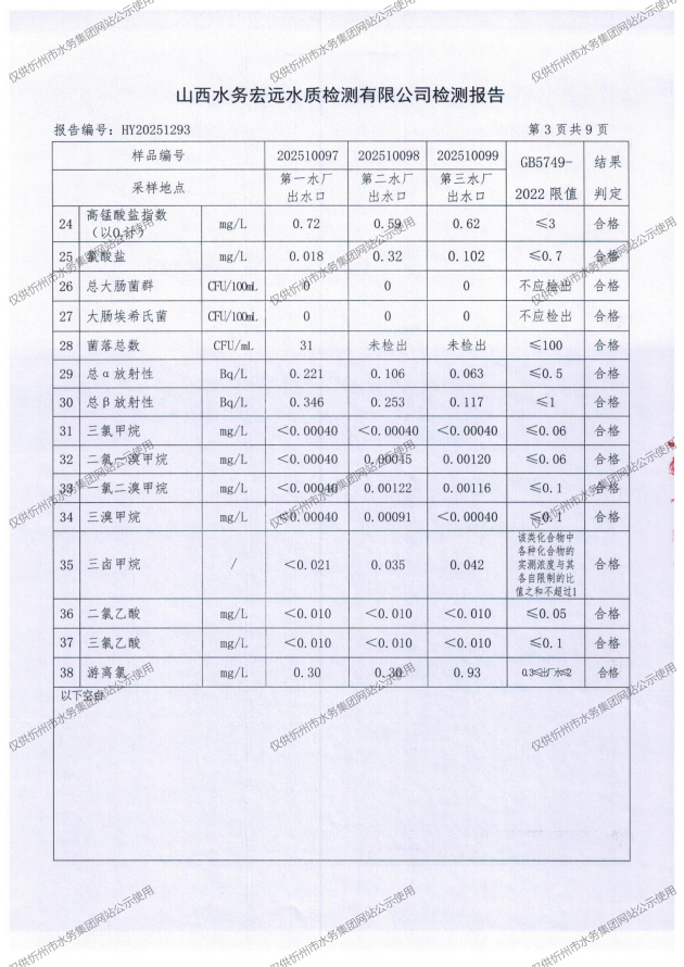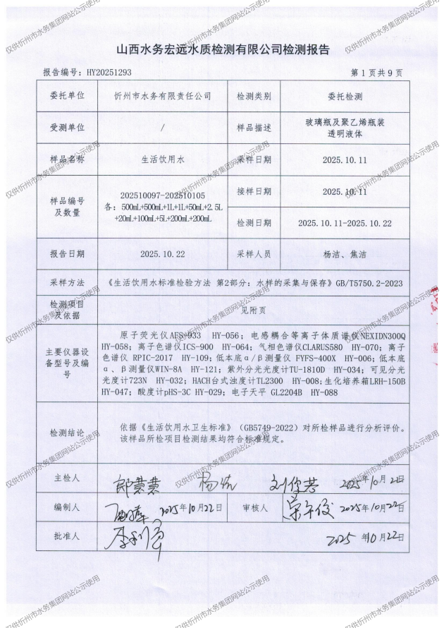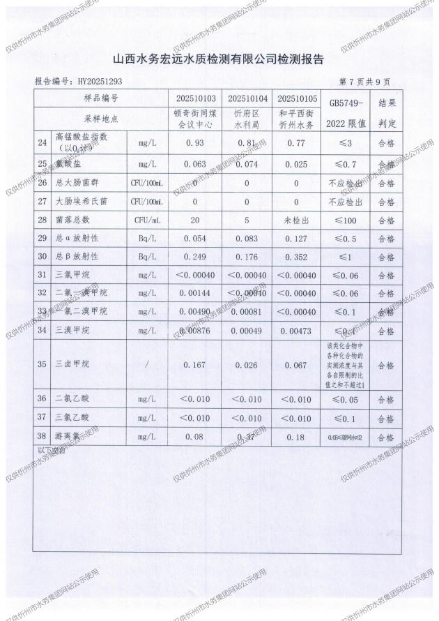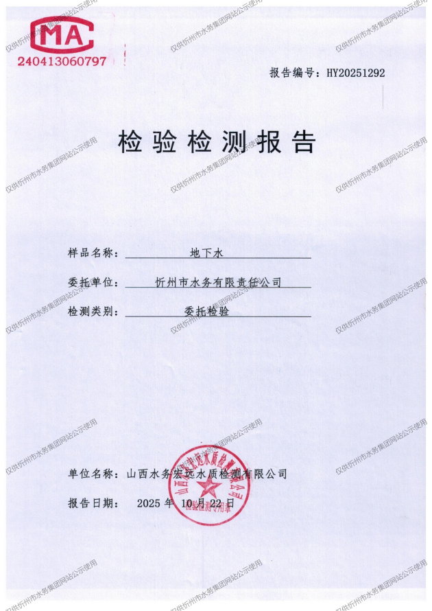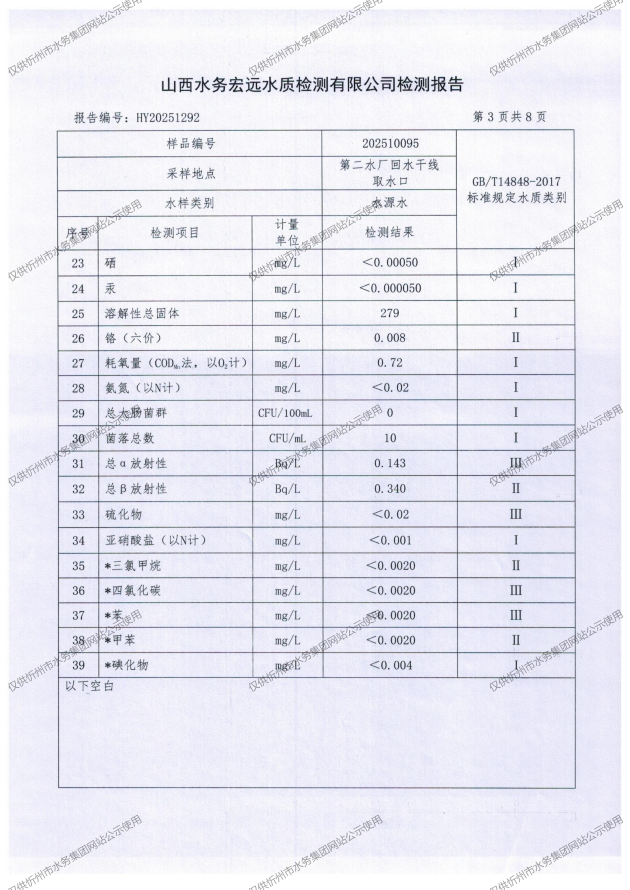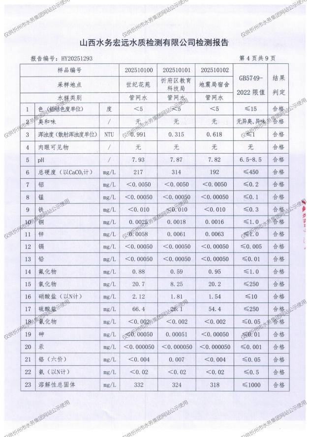 忻州城區(qū)公共供水水源水、出廠水、管網(wǎng)水、管網(wǎng)末梢水2025年10月份水質(zhì)信息公示