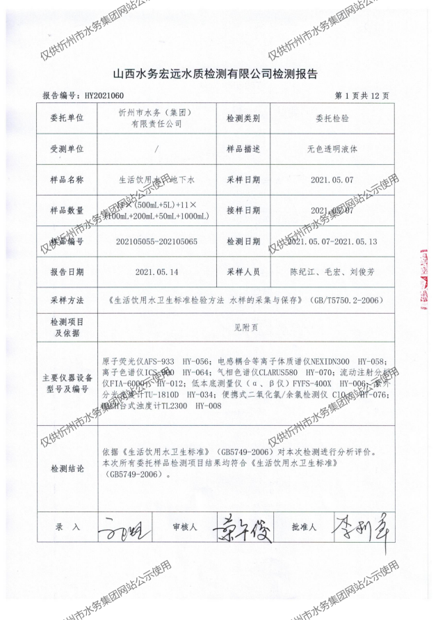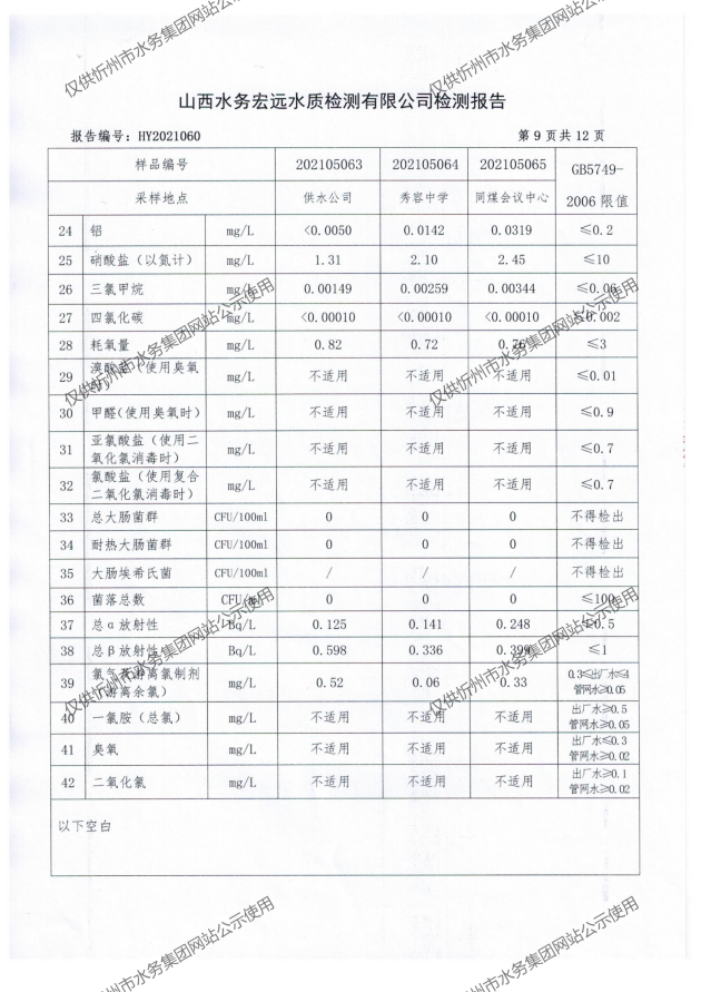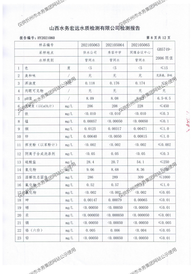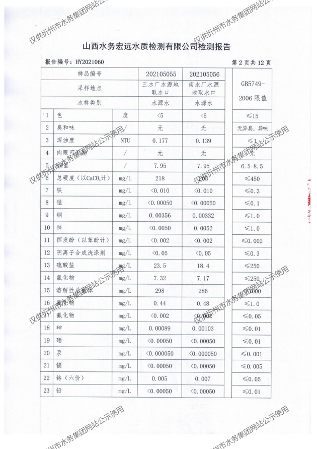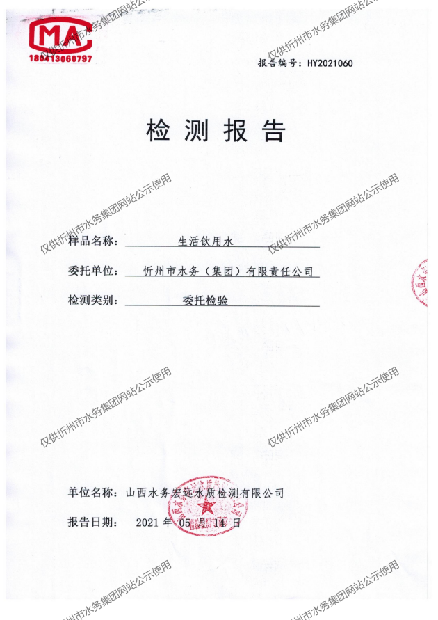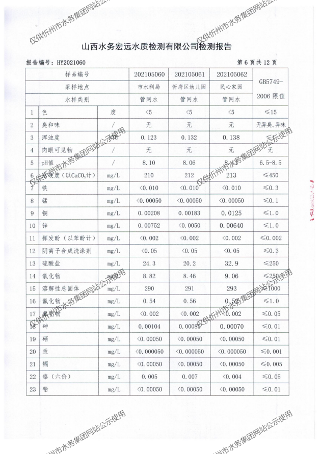 忻州城區(qū)公共供水水源水、出廠水、管網水、管網末梢水2021年5月份水質信息公示